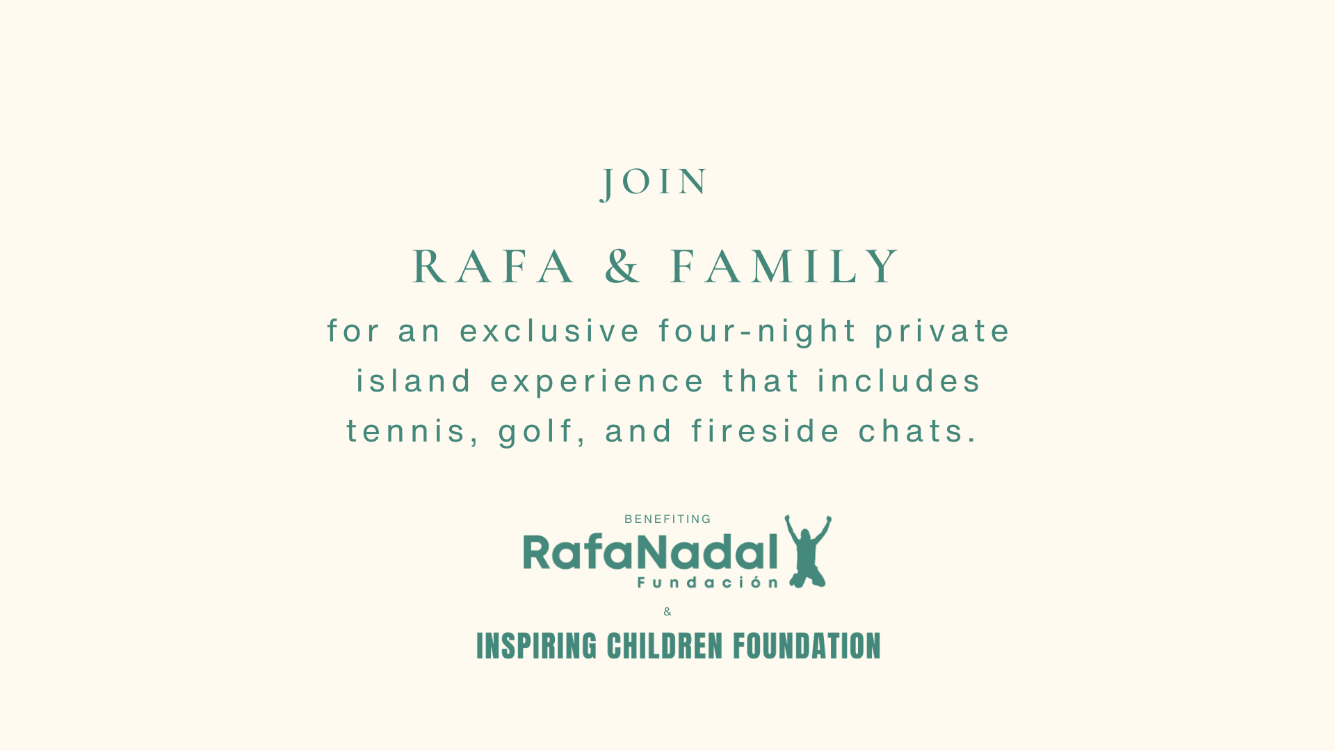 We are hosting a truly intimate and exclusive experience with one of the greatest tennis players in history, Rafael Nadal, and his family for incredible causes. This 5 Day, 4 Night gathering on a private island is designed to be relaxed, meaningful, and deeply personal, bringing together tennis, golf, conversation, and time to connect in a beautiful setting. 100% of the cost of attendance supports Inspiring Children and the Rafa Nadal Foundation.